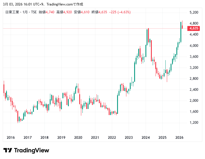 下記は日東工業10年間の株価チャートの動きです。