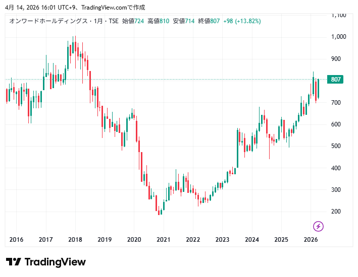 オンワードHDの10年間の株価チャートの動きを見ていきます。