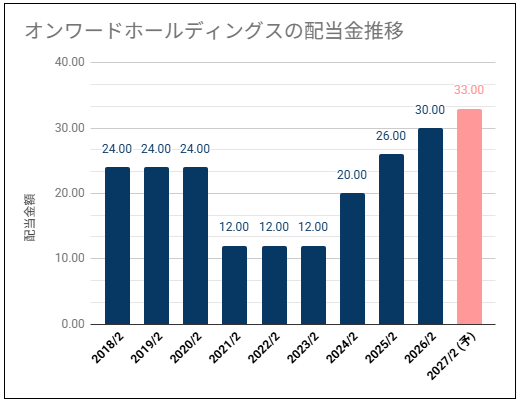 配当は2021年2月期に減配していますね。2024年2月期以降は増えており、2027年2月期も増える予定ですが、長期の配当狙いとしては慎重に見ていきたいですね。
