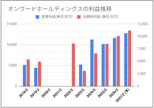 オンワードHDの過去10年分の営業利益と当期純利益をグラフにしてみました。