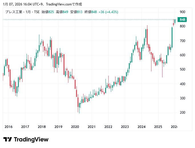 プレス工業(7246)の配当金診断。高い利回りで安定期待だが株価は高い位置