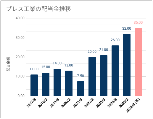 プレス工業は年2回 (中間・期末) の配当を実施してます。3月末が決算です。