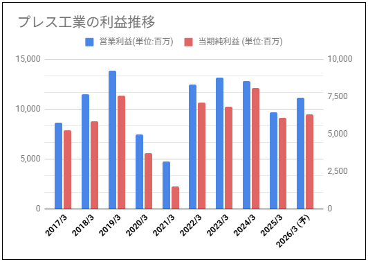 過去10年分のプレス工業の営業利益と純利益のグラフを確認していきます。