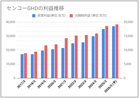 過去10年分のセンコーHDの営業利益と純利益のグラフを確認しています。