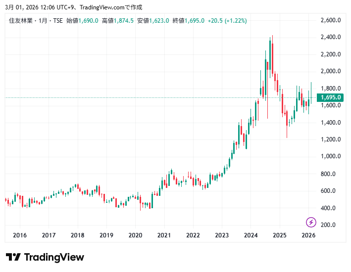 住友林業の10年間の株価チャートの動きです。