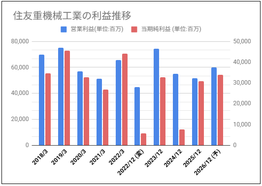 住友重機械工業の過去10年分の営業利益と純利益のグラフを確認していきます。