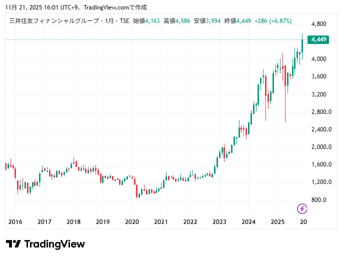 下記は三井住友フィナンシャルグループの株価チャートの動きです。
