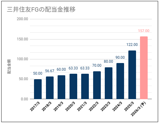 過去の三井住友フィナンシャルグループの配当金推移を確認していきます。
