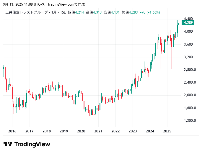 下記は三井住友トラストグループの10年分の株価チャートの動きです。