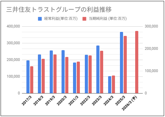 三井住友トラストグループの経常利益と当期純利益をグラフにしてみました。