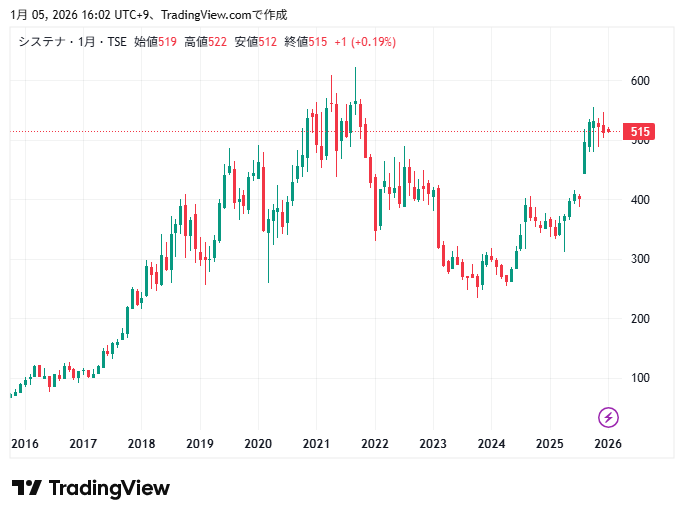 システナの10年間の株価チャートの動きです。