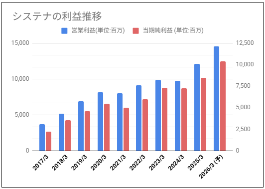 過去10年分のシステナの営業利益と純利益のグラフを確認していきます。