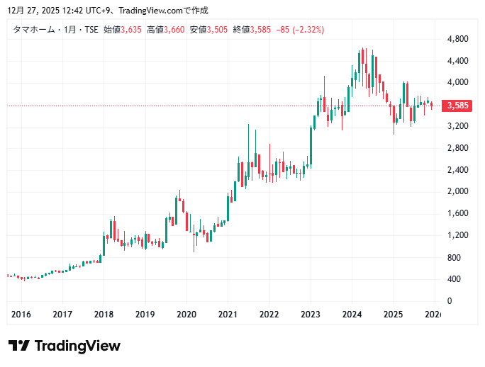 タマホームの10年間の株価チャートの動きです。