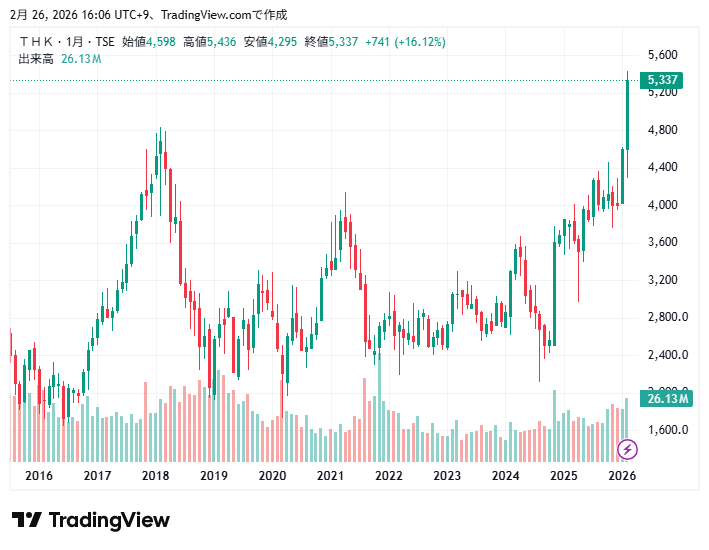 THKの年間配当金は184円予定、株価は5,337円なので年間配当利回りは約3.5%です。
