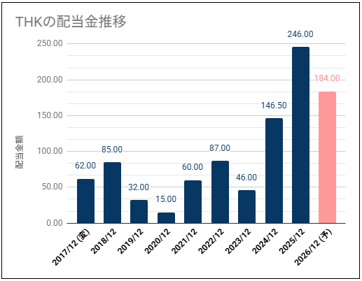 THKは年2回 (中間・期末) の配当を実施してます。12月末が決算です。