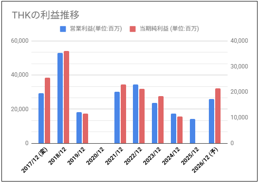 THK過去10年分の営業利益と純利益のグラフを確認していきます。