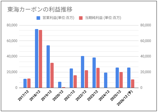 東海カーボンの過去10年分の営業利益と純利益のグラフを確認していきます。