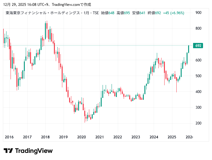 東海東京フィナンシャルHDの年間配当金は28円、株価は692円なので年間配当利回りは約4%です(配当金は2025年3月期)。