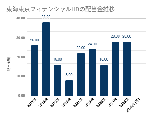 東海東京フィナンシャルHDの配当金がどのように推移しているのかグラフにして見ました。