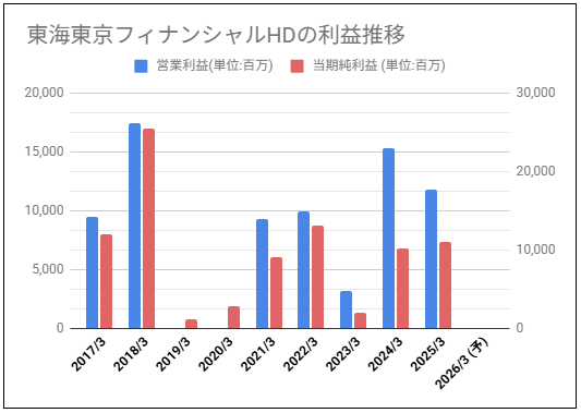 東海東京フィナンシャルHD過去の営業利益と純利益のグラフを確認していきます。