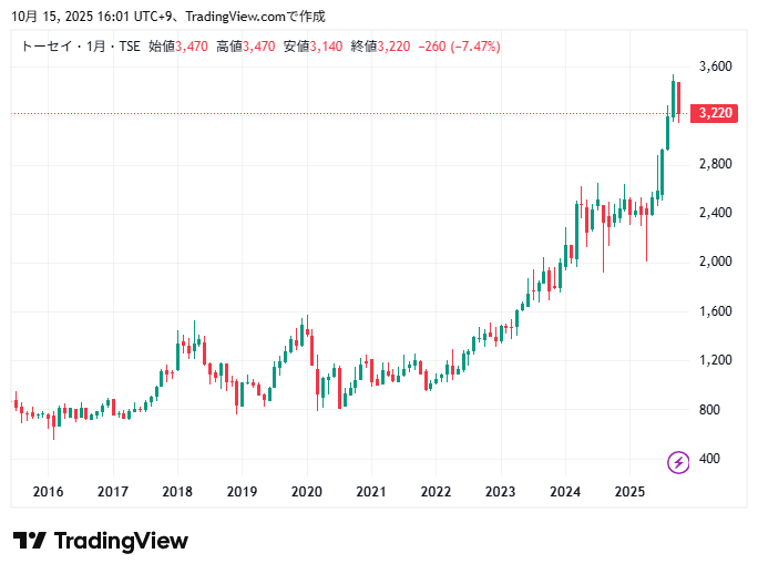 トーセイの10年間の株価チャートの動きです。