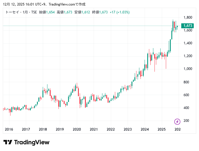 トーセイの年間配当金は50円予定、株価は1,673円なので年間配当利回りは約3.0%です。