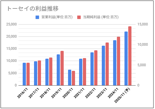 過去10年分のトーセイの営業利益と純利益のグラフを確認していきます。