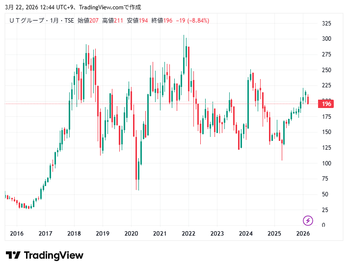 UTグループの年間配当金は10.85円予定、株価は196円なので予想年間配当利回りは約5.5%です。