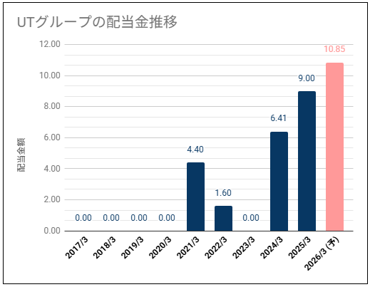 UTグループ過去10年分の配当金の推移をグラフで確認していきます。