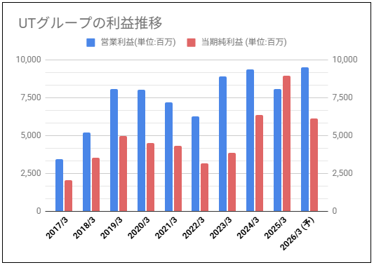 UTグループ過去10年分の営業利益と当期純利益をグラフにしてみました。