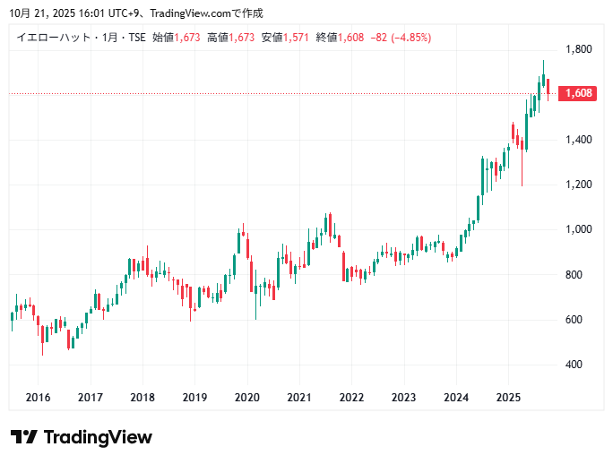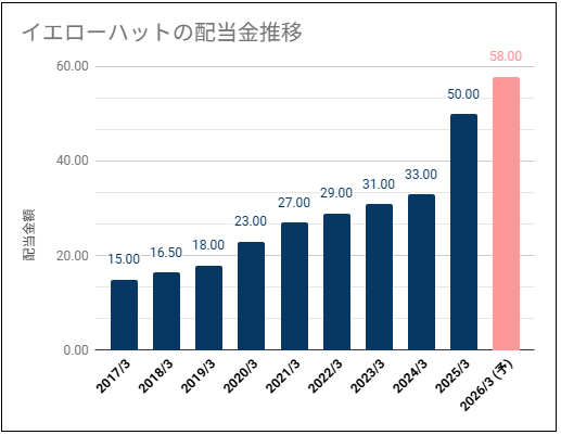 イエローハットの年間配当金は58円予定、株価は1,608円なので予想年間配当利回りは約3.6%です。