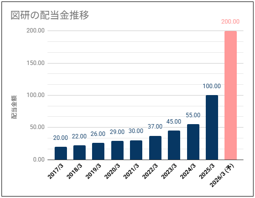 配当は増配で推移しているので、いい感じですね。2025年3月期は大きく増配、2026年3月期も大きく増配予定ですね。2026年3月期は記念配当が100円なので、今後の配当がどうなるか確認したいですね。